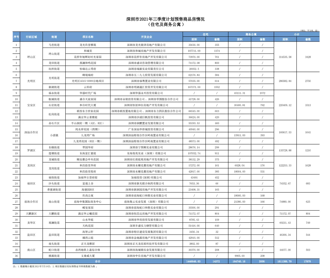 刚刚,深圳市住房和建设局发布2021年三季度深圳商品住宅和商务公寓房源信息情况。