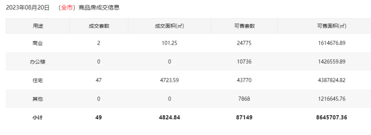 8月20日新房住宅共网签47套。宝安23套;福田1套;龙岗2套;罗湖2套;南山2套;盐田0套;龙华7套;坪山4套;光明5套;大鹏0套;深汕1套。8月20日二手房住宅网签15套。深圳8月一手住宅累计网签1449…