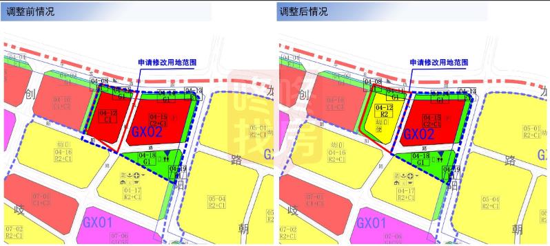 拟将04-08、04-11、04-12地块调出GX02单元,其中04-11地块用地面积由2831平方米调整为3854平方米,用地性质为公园绿地(G1);