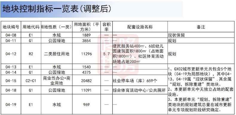 04-12地块用地面积由12319平方米调整为11296平方米,规划用地性质由商业用地(C1)调整为二类居住用地(R2),容积率调整为5.7,同时配建便民服务站400平方米、6班幼儿园1800平方米(占地1800平方米)、社区体育活动场地(占地200平方米);04-08规划为水域,备注为现状保留。