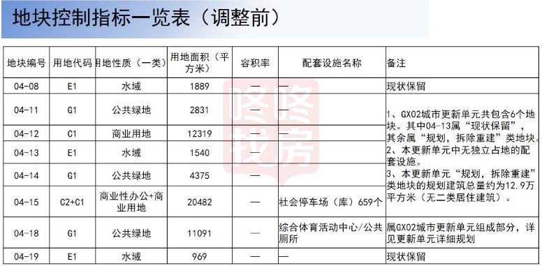 备注:“(1)GX02城市更新单元共包含5个地块(04-19为局部地块),其中04-13、04-19属“现状保留”,其余属“规划,拆除重建”类地块。(2)本更新单元中无独立占地的配套设施。(3)本更新单元“规划,拆除重建”类地块的规划建筑总量在城市更新单元专项规划阶段研究确定”。