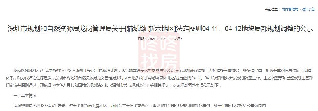 3月2日,深圳市规划和自然资源局龙岗管理局发布关于[辅城坳-新木地区]法定图则04-11、04-12地块局部规划调整的公示。