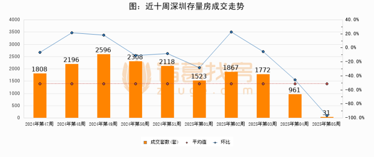 存量房方面,第05周深圳存量房成交31套,较上周减少930套,环比下降96.8%。从近十周成交走势来看,周均成交套数为1718套,本周低于平均水平98.2%。