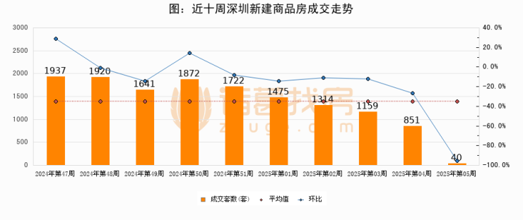 进入2025年第05周(01月27日-02月02日),深圳新建商品房成交40套,较上周减少811套,环比下降95.3%