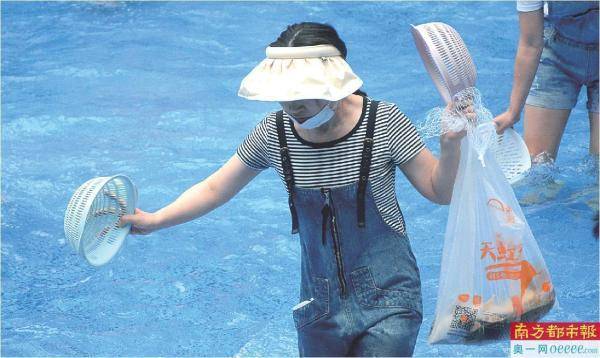 当天上午,大家都在外出旅游的时候,深圳坂田信义御珑豪园的居民几乎无人外出,大家拖家带口,大人穿着短裤拖鞋、小孩穿着泳衣,有人拿着捞网、有人提着水桶,甚至还有人直接拿了厨房的菜篓出来。他们围着小区泳池排着队,一心想参加小区物管举办的捕鱼达人活动。