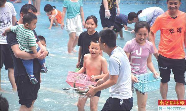 大声公一声“开始”,泳池里水花四溅。捕鱼现场,大人和孩子一起围堵鱼儿,捞网捞、菜篓捞、徒手抓……泳池里,抓到鱼的欢笑声、眼见鱼逃脱的尖叫声、玩水的嬉戏声、岸上爷爷奶奶的呐喊声,此起彼伏,很是欢乐。