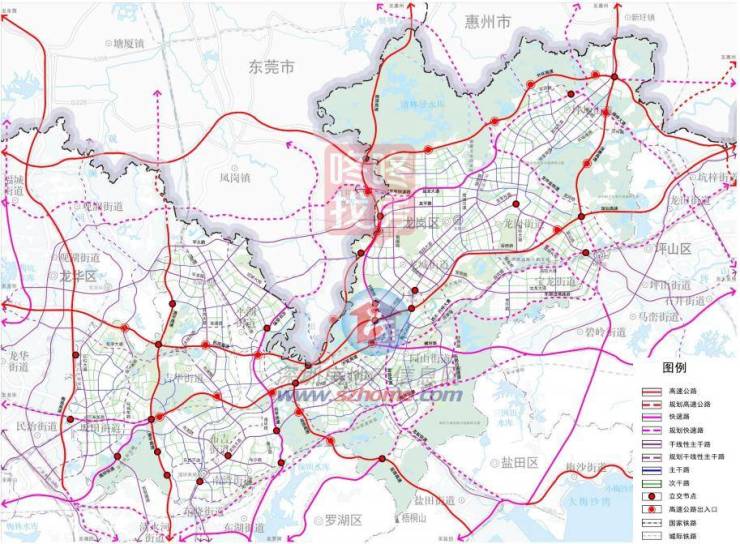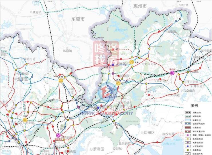● 交通方面,东西布局厦深、深汕、深河三条高速铁路,南北布局广深铁路,打造“西联 东进、南北通达”的铁路网络。高标准建设龙岗区“2+4+2+2” (全国性-区域性-城市级-片区级)十大枢 纽体系,实现各级枢纽与城市空间的融合,高效服务居民出行。