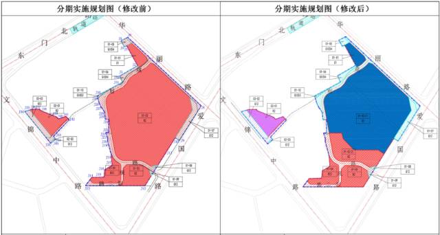 修改木头龙小区更新单元01-02(2)、01-03、01-04、01-08和01-09地块为一期实施,其余地块为二期实施。三角地更新单元保持不变。