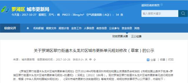 2017年10月26日:罗湖区城市更新局发布《关于罗湖区翠竹街道木头龙片区城市更新单元规划修改(草案)的公示》。根据修改内容木头龙旧改将分两期实施。