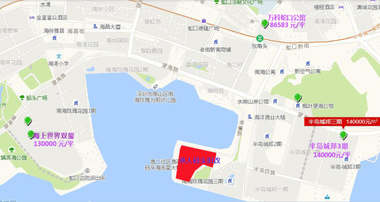 如图所示,渔人码头旧改项目紧靠南山玫瑰园花园三期,临近半岛城邦,靠蛇口渔港,据2016年公布的蛇口渔人码头(蛇口渔港)旧改方案,该项目将建成3栋超高层建筑,还将建设1800平米的海洋主题馆。这一信息在楼市掀起了千层浪,而目前周边的房价如何呢?