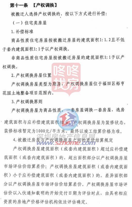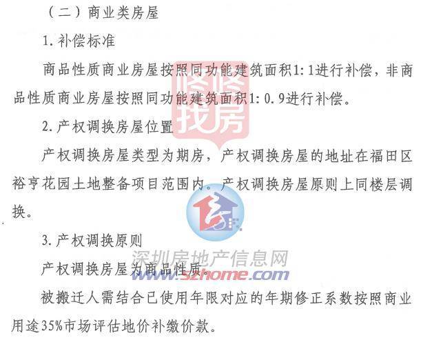 福田区裕亨花园土地整备项目实施方案公示,住宅类产权调换补偿商品房按建面1:1.2且不低于套内建面1:1补偿;非商品房按建面1:1补偿。
