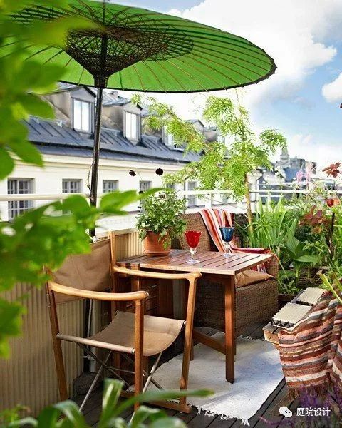 露台,除了沙发、座椅、靠垫、绿植外,遮阳伞也是必不可少的组成,在阳光充足的午后,一把能遮阳的大伞让你家露台增色不少。