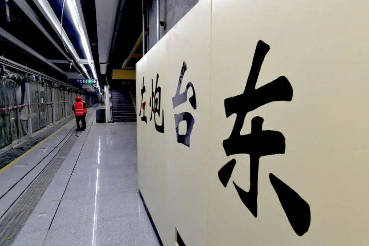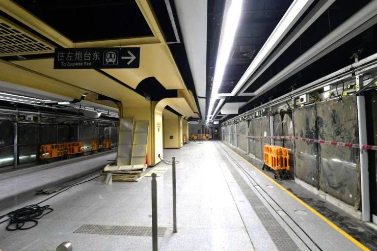 左炮台东站装修以明黄为主色调,站厅内照明设施、电扶梯等装置均已就位,候车区域的“左炮台东”站点标志已经装好。