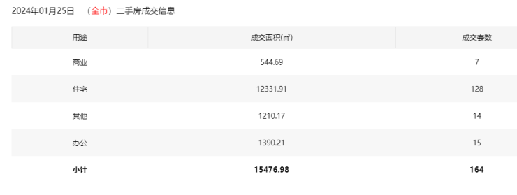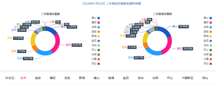 2024年1月25日二手房住宅网签128套。宝安13套;福田20套;龙岗30套;罗湖24套;南山22套;盐田2套;龙华11套;光明1套;坪山5套;大鹏0套。