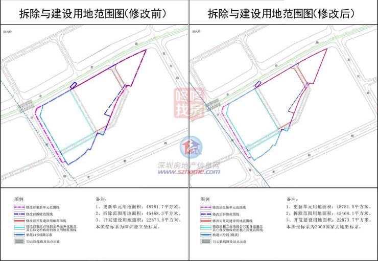 根据《市规划和自然资源局关于我市全面启用2000国家大地坐标系的通知》,我市自2020年10月8日起全面启用2000国家大地坐标系,项目由深圳独立坐标系转换为2000国家大地坐标系后,更新单元用地面积由48781.7平方米调整为48781.5平方米,拆除范围用地面积由45468.3平方米调整为45468.1平方米,开发建设用地面积由22873.8平方米调整为22873.7平方米。本次规划修改使用的数据均为转换坐标系后的数据。