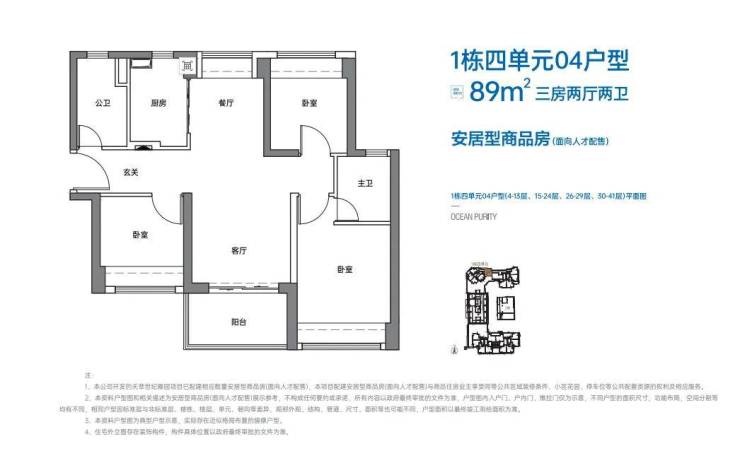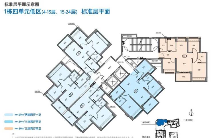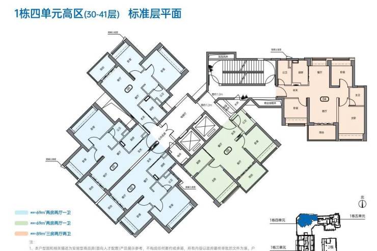户型方面,三房89㎡有2个户型,两房69㎡则有多个户型,户型没有标注尺寸,实际得房率约71%左右,相对较少。