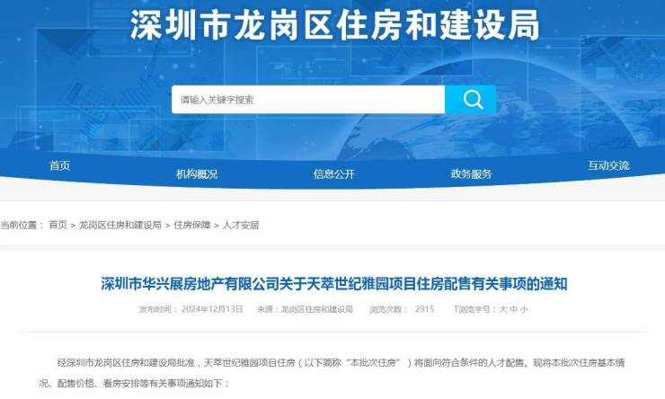 据龙岗住建局消息,位于坂田的人才房项目天萃世纪雅园已发起配售,线上申请认购时间为:2024年12月16日09:00至2025年1月5日18:00。