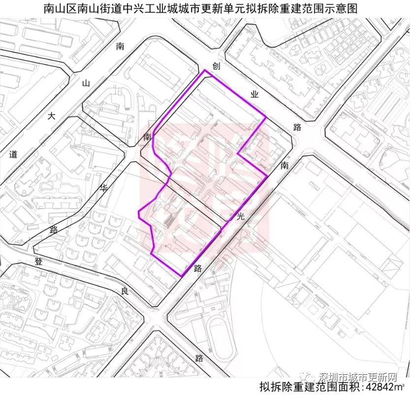 南山区南山街道中兴工业城项目位于创业路与南光路交汇处,拟拆除重建用地面积42842㎡。