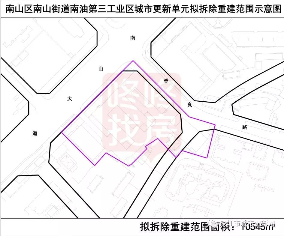 南山区南山街道南油第三工业区项目位于南山大道与登良路交汇处。拟拆除重建用地面积10545㎡。