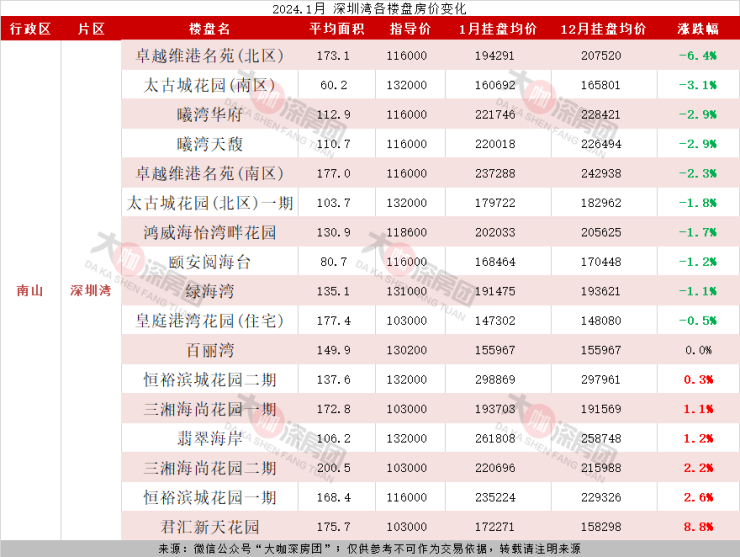 深圳湾有效挂盘共有17个小区,其中挂盘均价下跌的小区有10个,占比总量的58.8%。