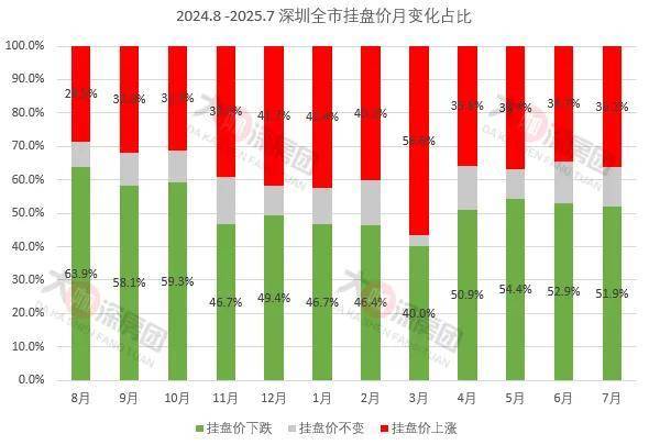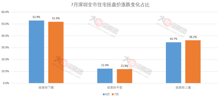 7月深圳挂盘均价下跌的楼盘占比51.9%,占比减少1%;上涨的楼盘占比36.2%,增加1.5%。