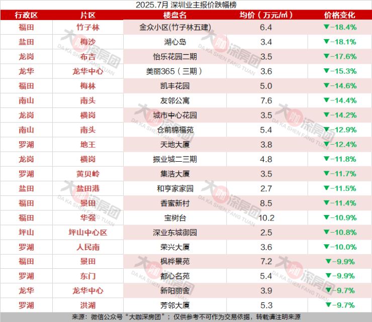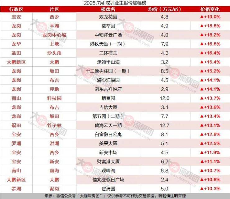 7月深圳业主报价出炉,涨跌幅TOP20小区曝光