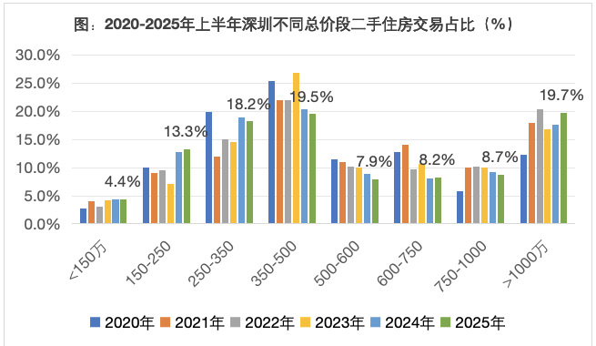 从上面深圳中原这张图,可以清楚地看到,这几年,低总价的房子占比在上升,350万以下占比36%,而且一直呈现上升的态势。350万-500万,这是刚改的集中区域,但占比近年来开始下降,500-1000万这个改善型的区间段,也在下降。而1000万以上的,今年上半年在上升。