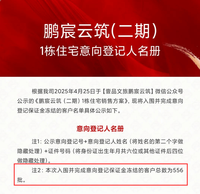 4月29日,鹏宸云筑公示意向登记人名册,官宣本次意向该保证金冻资客户总数为556批。
