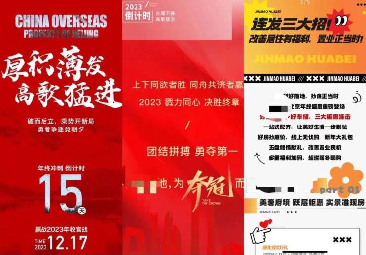 每经记者了解到,12月初,金地集团北京公司就举行了年终冲刺誓师动员大会,主题是“同心决战,必胜2023”;12月15日,金茂北京在官微发布五盘年终福利,包括西山金茂府北区5套一口价现房、金茂北京国际社区所有房源全场九六折(截至12月31日)等;12月18日,中建智地官微发布海报,主题是“冲刺2023,为夺冠而战!”以及“战到底”“再超越”“团结拼搏,勇夺第一”等推广语……