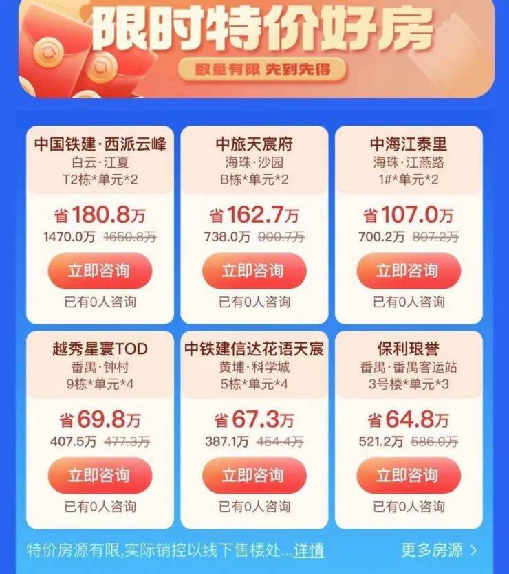此外,黄埔、番禺等区域的新房虽然总价较低,也推出一批总价优惠20万-60万元的特价房源。