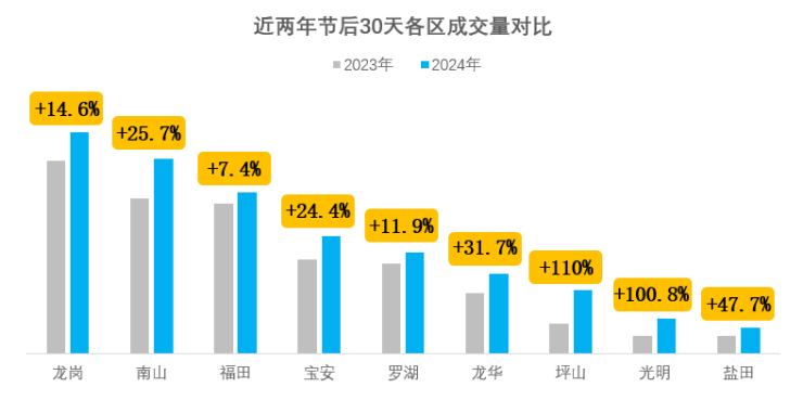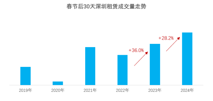 春节假期结束后,深圳迎来大量就业人员的回归,租房需求旺盛,推动了成交量的增长,令市场热度加速上升。根据深圳贝壳研究院数据统计,今年春节后30天成交量同比增长28.2%,并且连续两年呈现正增长。