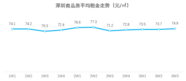 租房需求旺盛、成交活跃度快速上升,令部分房东出现涨租预期,进而推动了租金的小幅上涨。根据深圳贝壳研究院数据统计,节后开工以来,深圳商品房平均租金连续四周呈现稳中有涨的趋势,最近一周(3.11-3.17)全市平均租金为74.9元/平方米,环比上涨1.6%。