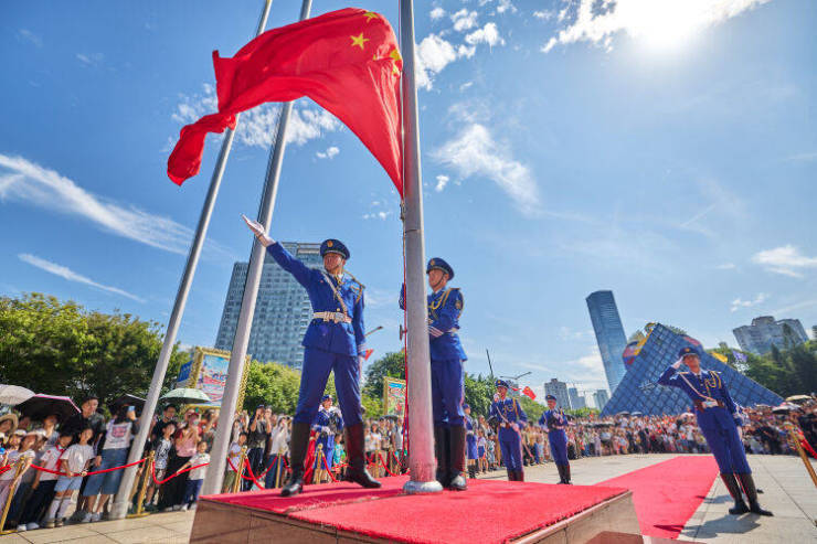 为响应国庆期间游客澎湃的爱国情怀,景区打造升旗仪式、国庆主题无人机编队表演、国庆主题狂欢大巡游、国庆氛围装饰打卡等国风国潮新体验,与景区所有市民游客共祝祖国美好。