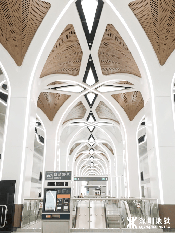 靠近石岩湿地公园与阳台山,车站引入“阳光、树叶”自然意象。天花板采用模块与叶脉元素交织,光影之间,感受自然与城市的和谐共鸣。