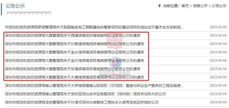 5月4日,深圳市规划和自然资源局大鹏管理局发布了东涌、西涌、金沙湾、大澳湾、沙鱼涌、金水湾 6 个海滨项目海域使用论证报告公示稿,目前处于公示期,公示期为2023年5月4日-2023年5月16日,10个工作日。