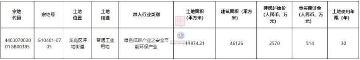 宗地号G10401-0705,土地位置龙岗区坪地街道,土地用途普通工业用地,准入行业类别绿色低碳产业之安全节能环保产业,土地面积11974.21平方米,建筑面积46126平方米,挂牌起始价2570万元,土地使用年限30年。