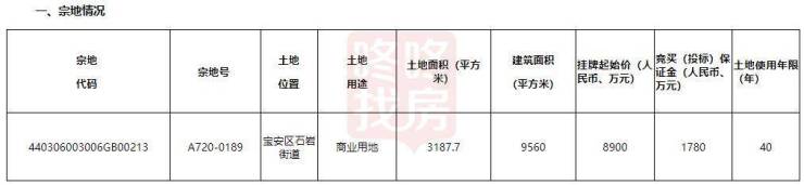 A720-0189宗地位于宝安石岩街道,占地面积3187.7平米,挂牌起始价8900万元,土地使用年限40年。