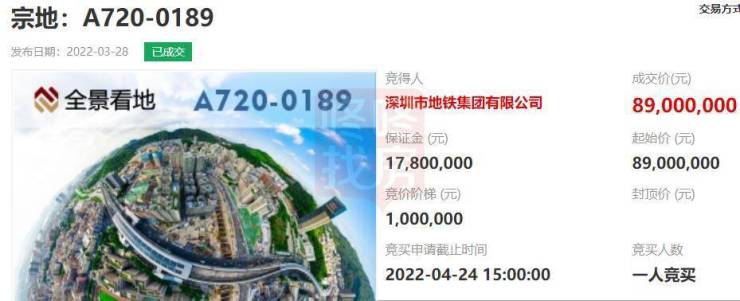 4月26日,宝安成功出让一宗商业用地,由深圳地铁以起始价8900万拿下。