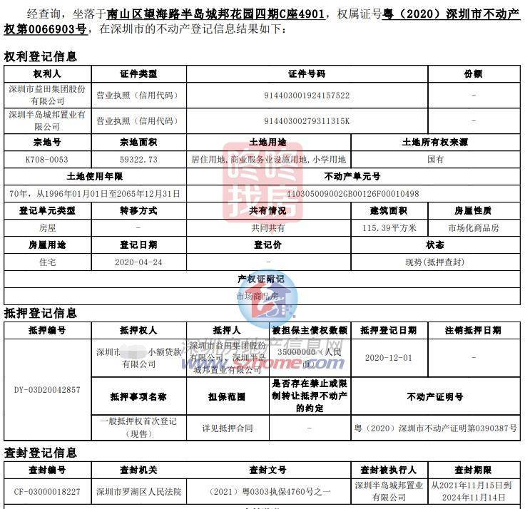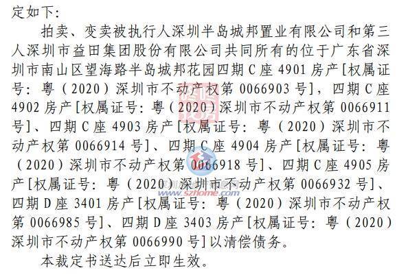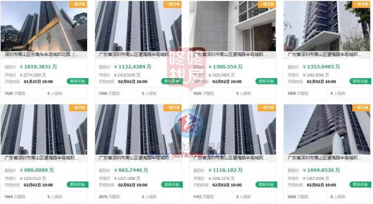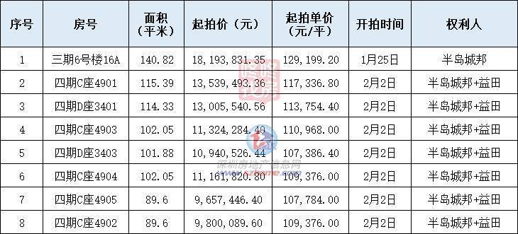 另外7套在1月30日开拍的为半岛城邦+益田两个开发商为权利人,四期的C座49楼的5套房源,以及四期D座的34层2套房源,将在2月2日开拍。
