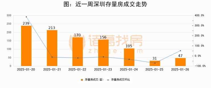 从存量房来看,2025年01月26日深圳存量房单日成交47套,比昨日增加16套,环比上涨51.6%。从近一周存量房成交来看,深圳存量房日均成交套数为137套,01月26日单日成交47套,低于近一周平均水平65.7%。