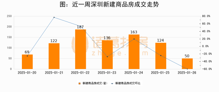 根据深圳市住房和城乡建设局数据显示,2025年01月26日深圳新建商品房成交50套,较昨日减少74套,环比下降59.7%