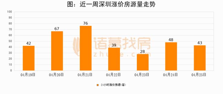 根据诸葛找房数据显示,深圳24小时涨价房源量为43套,较04月24日减少5套,环比下降10.4%。与此同时,涨价房源占比小幅回落,对于购房者来说是一个入市窗口期,购房者可抓住时机入市。