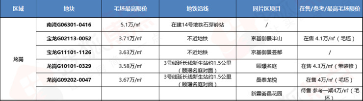 该宗地所在位置是龙华核心居住位置,虽然距离两个地铁口的步行距离在1公里左右,不过周边商业及市政配套都已完善。旁边是龙光玖悦台,去年开盘均价约9.05万/㎡,而此次该地块毛坯限售均价在6.98万/㎡。