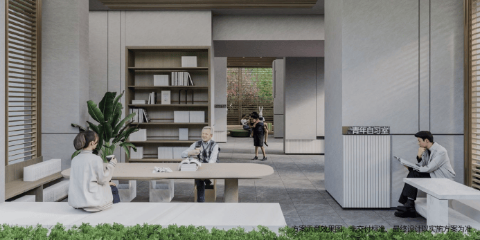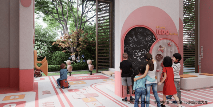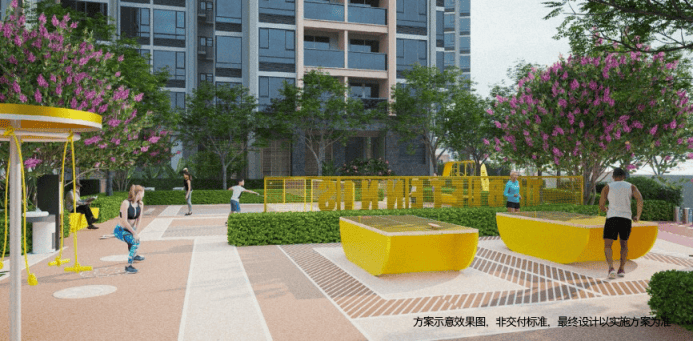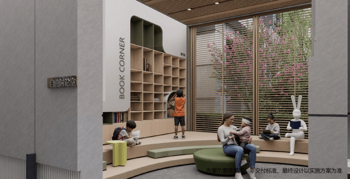 约1500平24小时运动聚落,设置羽毛球、乒乓球、儿童游乐园、成人健身器材等