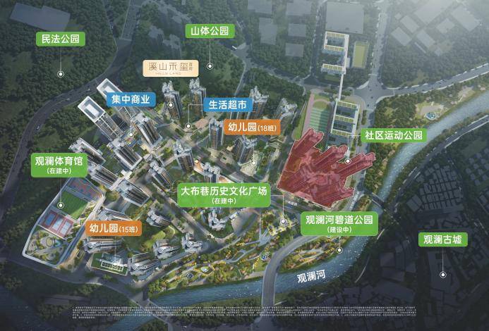 御府地块位于最高近观澜河位置的地块,三面环景无遮挡;北面是九年一贯制学校、南面是历史文化公园和观澜河景观、东面是观澜古墟;享受随时下楼钓鱼、遛娃、露营、慢跑的惬意生活,晚上邀约朋友去观澜古墟撸个串,你所羡慕的生活这里都能满足你;