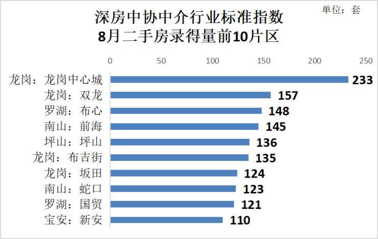 片区:细分到片区看,龙岗中心城以233套的录得量远超其他片区,前10片区中龙岗区有4个,表明现阶段市场以刚需及换房为主。具体如下: