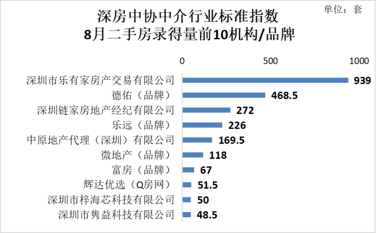 从行业竞争角度,深房中协以独立法人机构及加盟品牌为计算锚点,2025年8月深圳市二手房录得量前10机构/品牌如下: