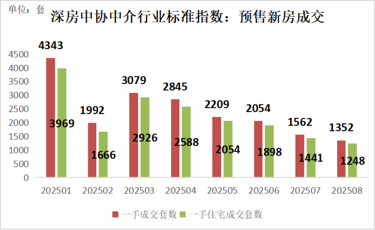 2025年8月全市预售新房共成交1,352套,环比下降13.4%,同比下降52.8%,其中住宅成交1,248套,环比下降13.4%,同比下降50.8%,新房预售市场持续低迷。