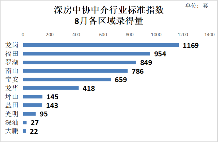 行政区:根据深房中协统计,8月龙岗区二手房录得1,169套,占总量22.2%,较上月下降0.1个百分点。具体如下:
