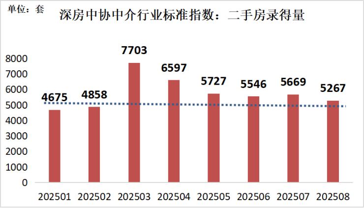 根据深房中协统计,2025年8月全市二手房录得【本文录得量系指深房中协以二手房买卖合同发起时间为口径统计的数据,并非最终成交套数】5,267套,环比下降7.1%,同比增长12.8%。二手房市场虽有所走弱,但单月录得量仍超5,000套,已连续6个月超行业“荣枯线(请见图中虚线)”。